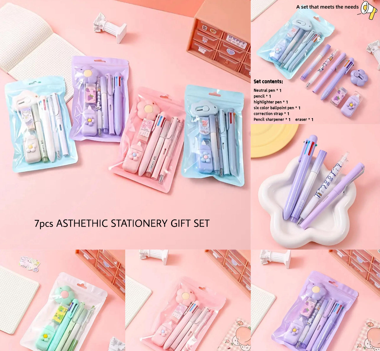 This 7-piece blue stationery set - features a 6-in-1 ballpoint pen, retractable gel pen, pencil, highlighter, correction tape, ruler, and utility knife. Crafted from durable, fade-resistant plastic, it weighs just 2.89 ounces and is designed for daily office, school, or home use. Its kawaii design adds a fun, motivational touch, making it a perfect gift for professionals and students alike.