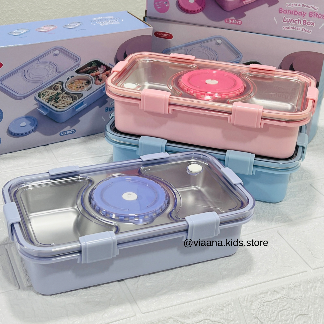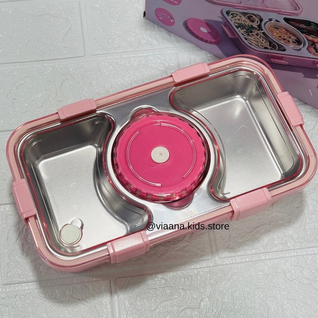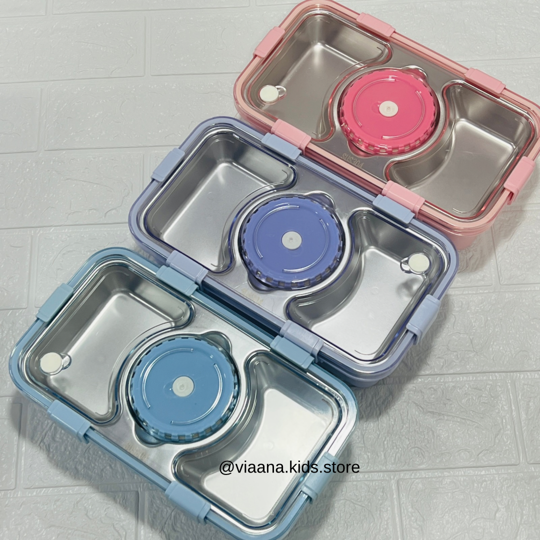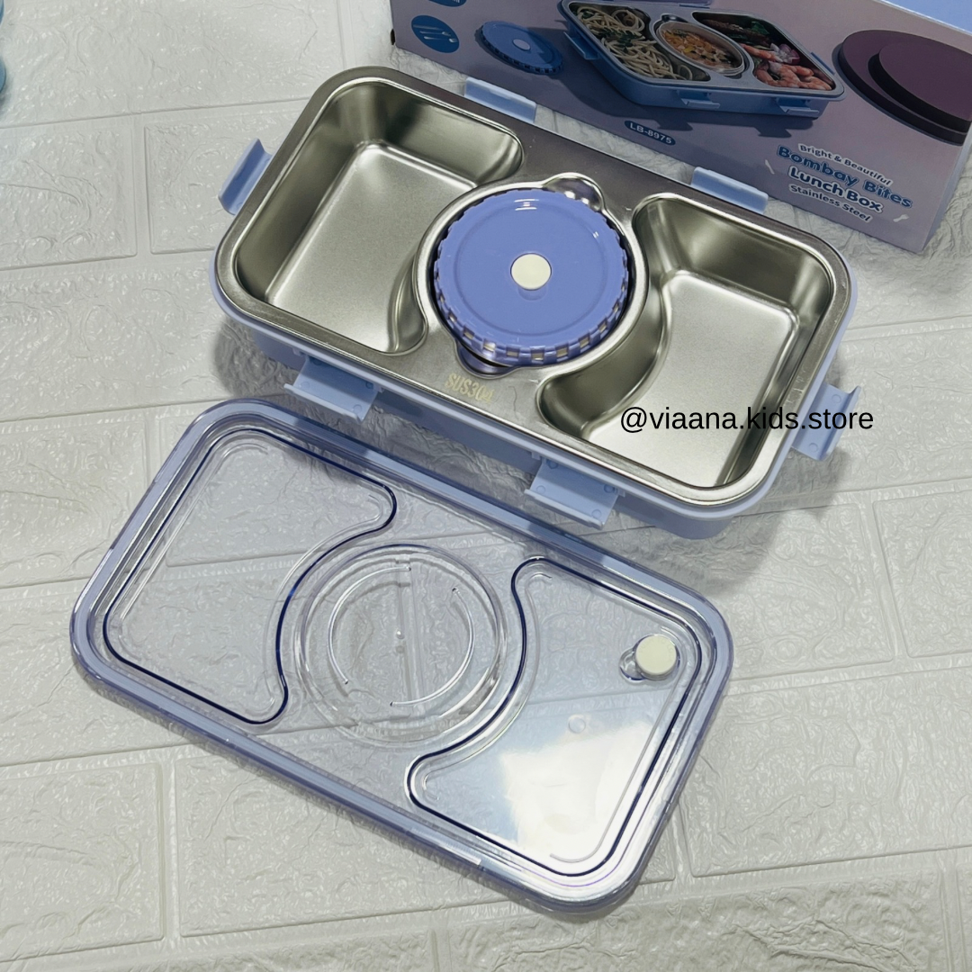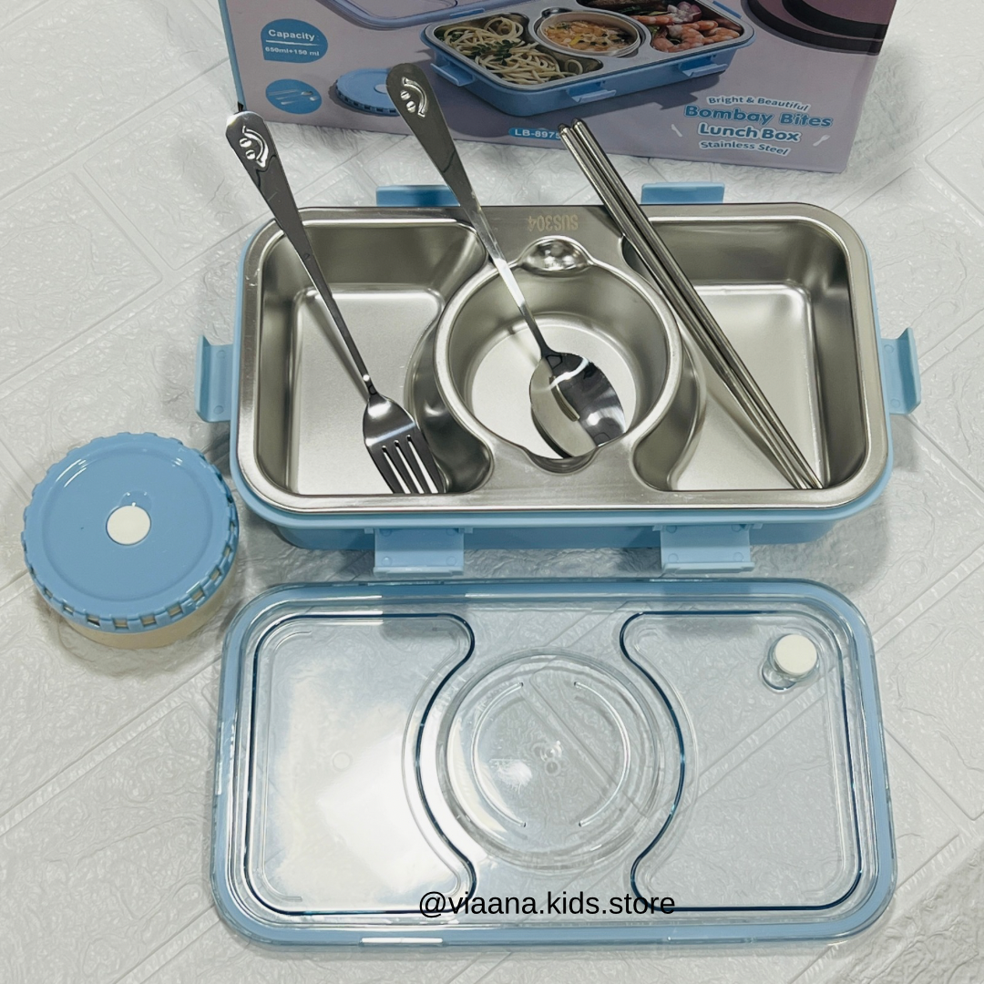 • Bento 3 compartments Insulated Stainless Steel Tiffin box with additional soup box and Steel Spoon/Fork/Chopstick set
