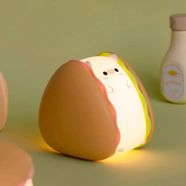 Add a playful touch to your room with the "Hamburger Piggy Night Lamp." Shaped like a hamburger with a piggy twist, this lamp emits a warm and comforting glow. It's not just a source of light; it's a delightful piece of decor that sparks joy and smiles.