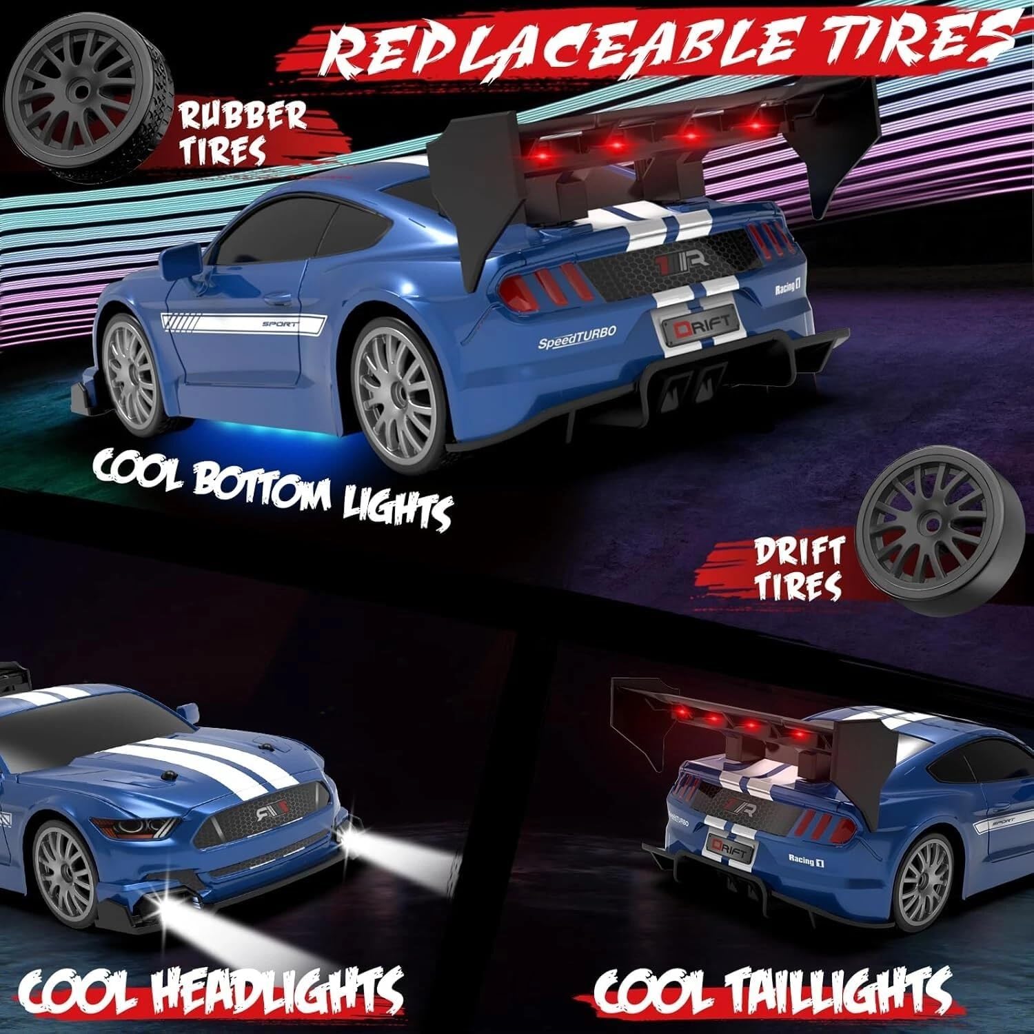- ā¦ļø Multi-Functional Drift Car: Equipped with a four-wheel drive system and a high-power motor, this car allows you to easily switch between high-speed racing and drifting with replaceable tires for added versatility.