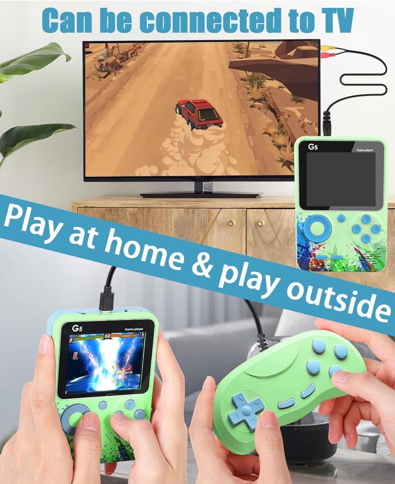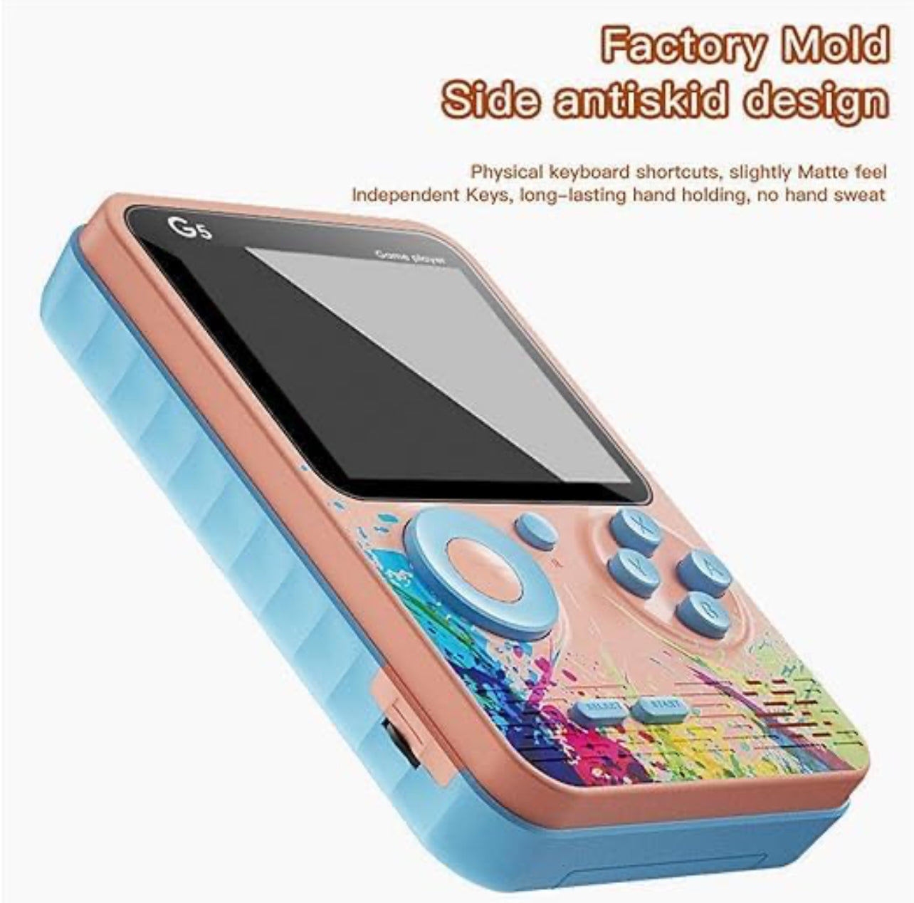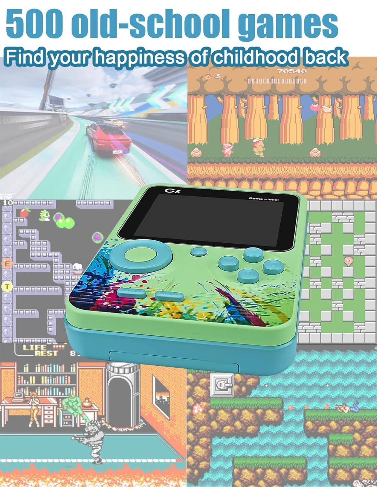 500 Hundred Classic Handheld Games G5, an ultimate handheld game console. Preloaded with hundreds of classic video games, including fighting, shooting, adventure, and puzzle challenges, it offers endless entertainment for both kids and adults.