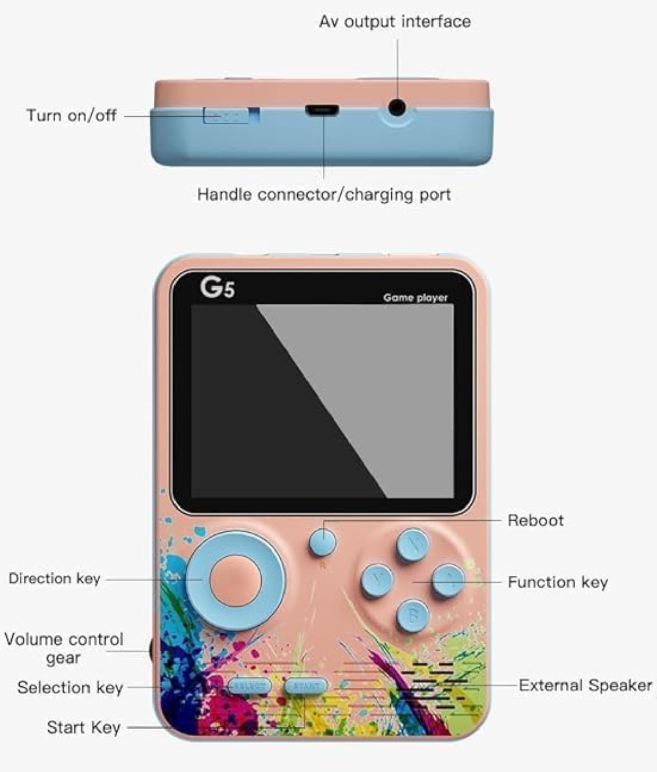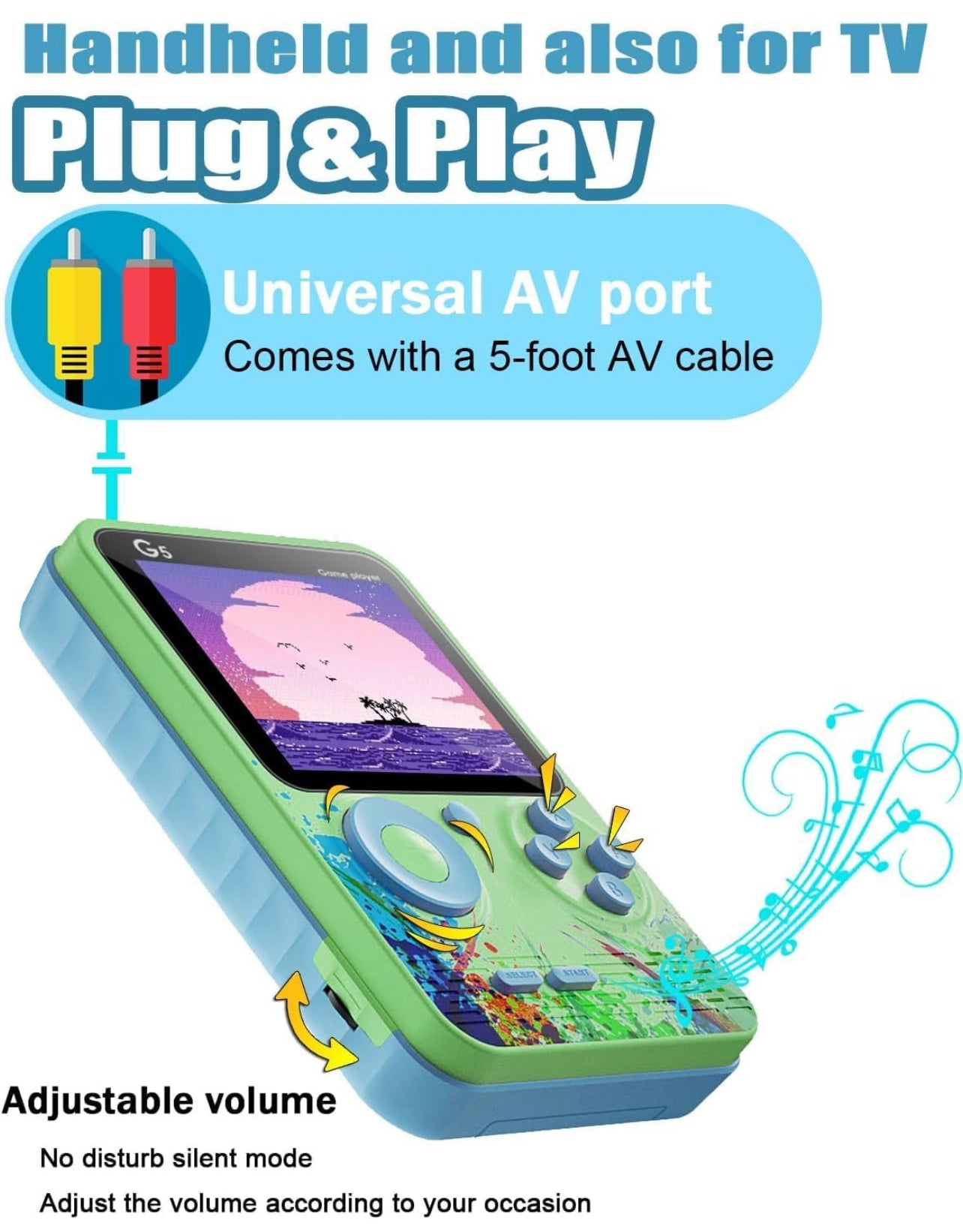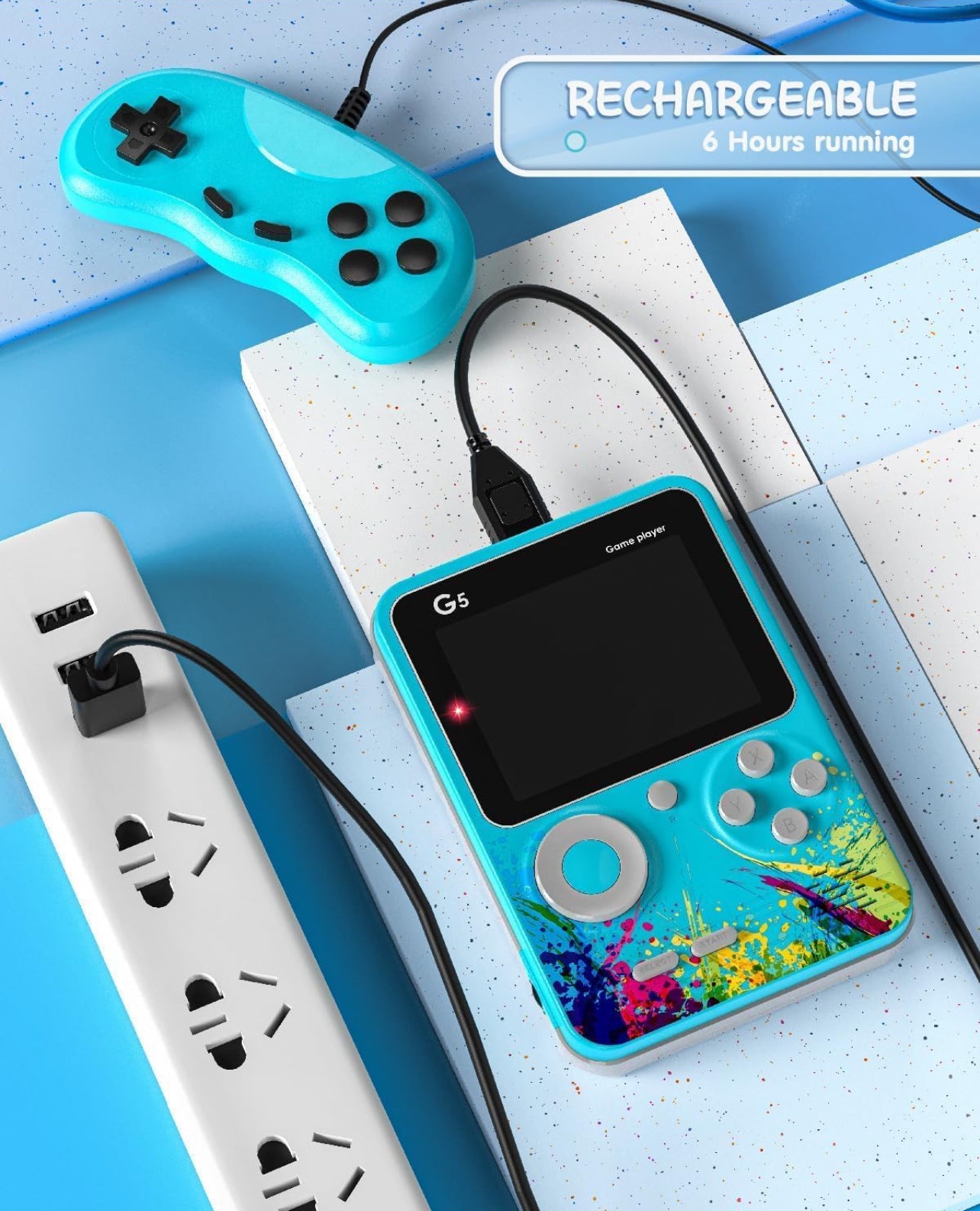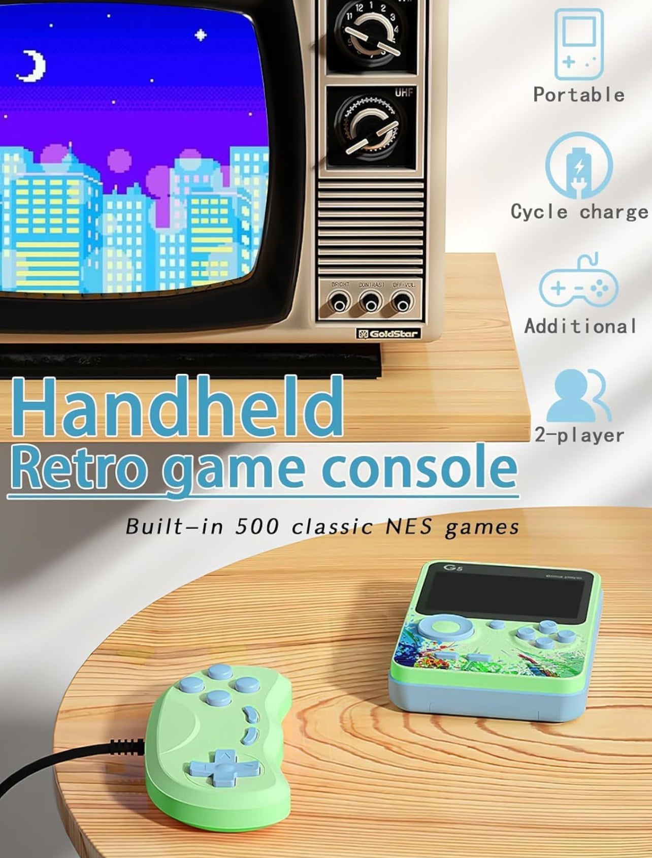500 Hundred Classic Handheld Games G5, an ultimate handheld game console. Preloaded with hundreds of classic video games, including fighting, shooting, adventure, and puzzle challenges, it offers endless entertainment for both kids and adults.
