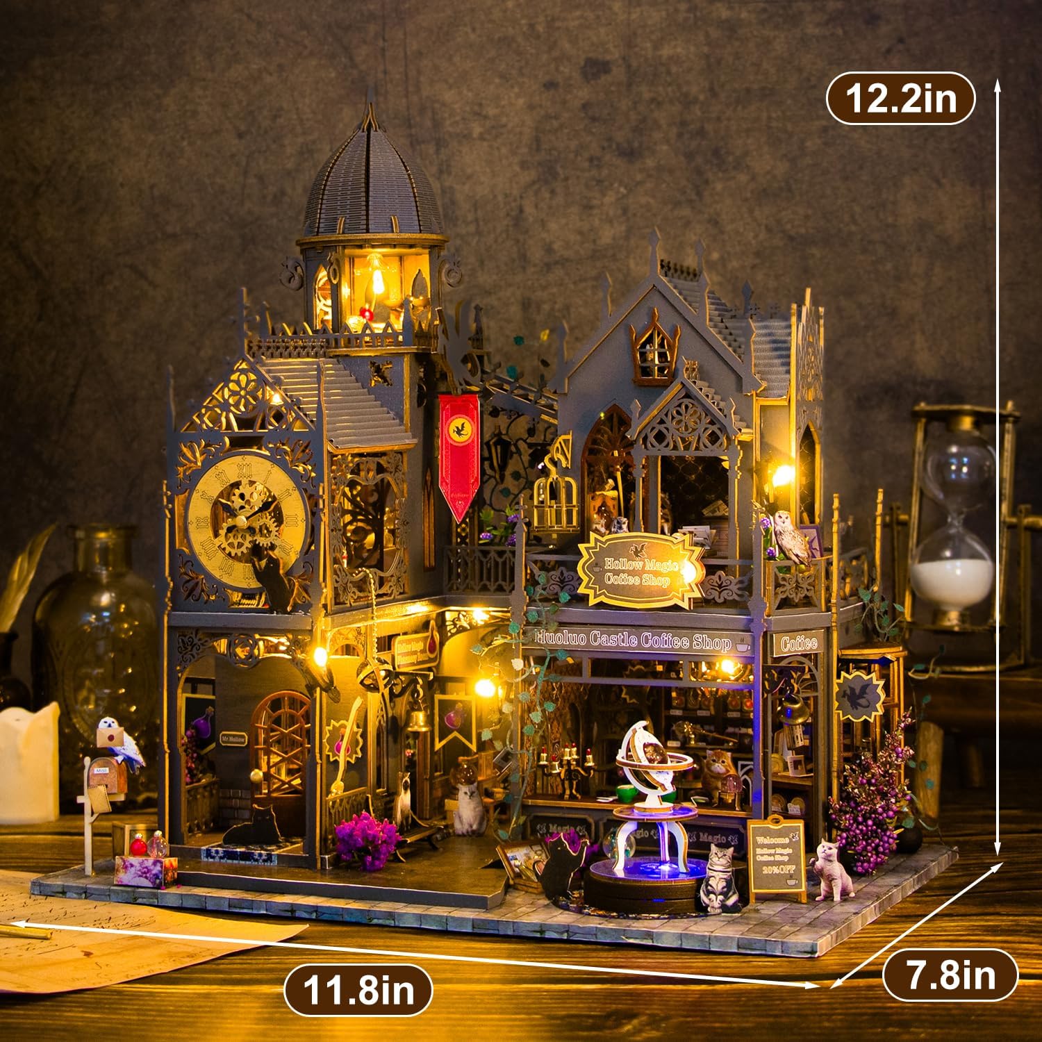 Warm LED Lighting – Soft amber lights illuminate windows, lanterns, and the interior, creating a magical night-time glow.