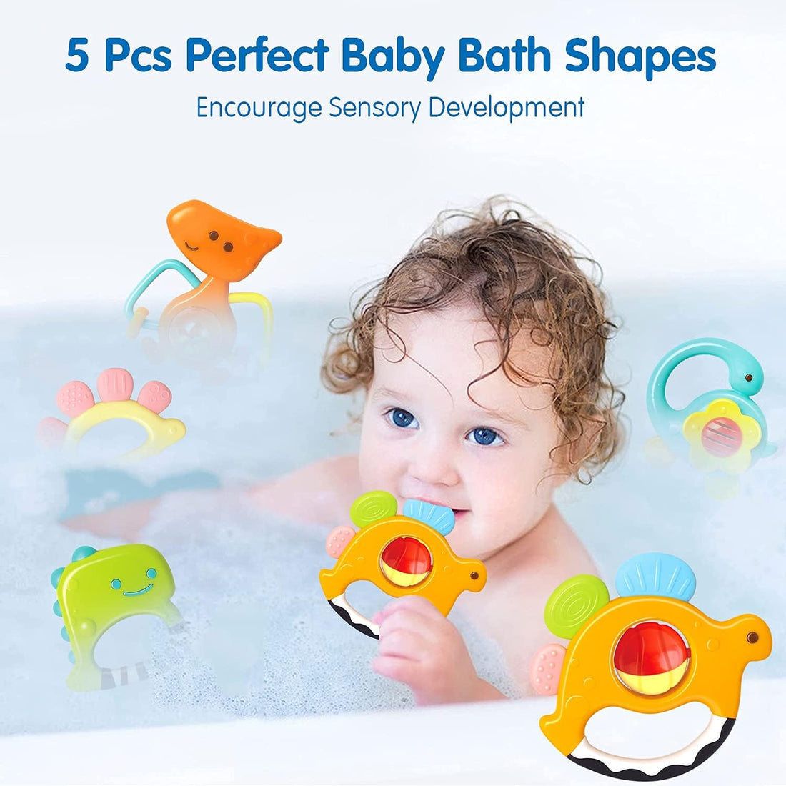 - ăBaby Rattles & Teethersă5 PCS Newborn Rattles and Teething Toys have Age-Specific Designs for Different Stages of Babyâs Development. Each Rattle Has Different Grips, Shapes and Tasks to Assist in Fine Motor Skills.