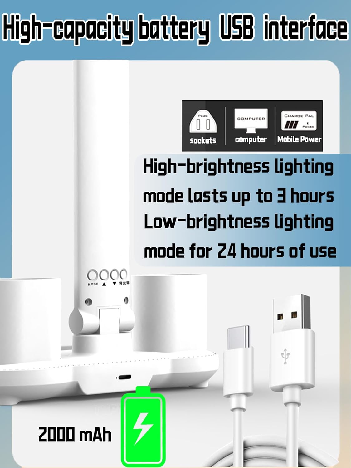 (High Capacity Battery) Built- in 2000mAh battery provides up to 4 hours of continuous illumination at maximum brightness and 24 hours at minimum brightness, and has a USB charging port for easy charging of smartphones or USB-compatible devices.When the power is insufficient, the lamp will keep on but the fan will stop rotating, please charge it in time to restore the normal operation of the fan