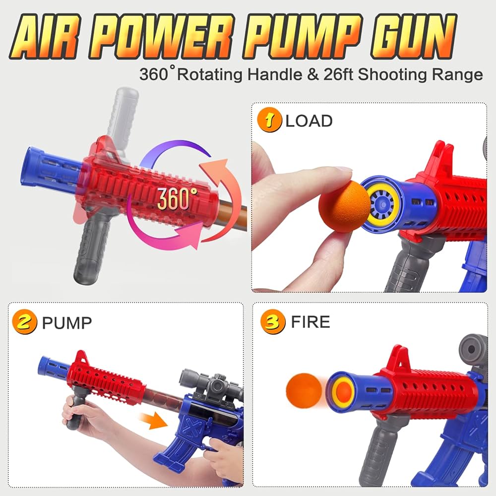 - INTERESTING SHOOTING GAME - Engage in a fascinating shooting game with this newly designed toy set. It includes 2 air-powered blaster guns, 24 soft foam balls in orange and green, and a unique electric rotating moving target. Perfect for both indoor and outdoor fun